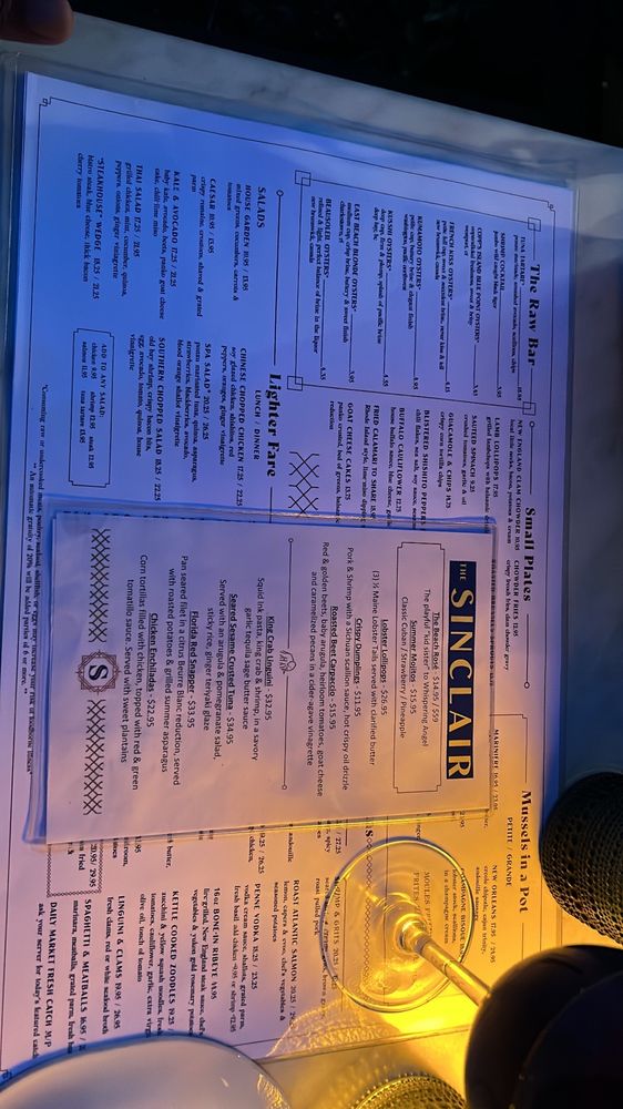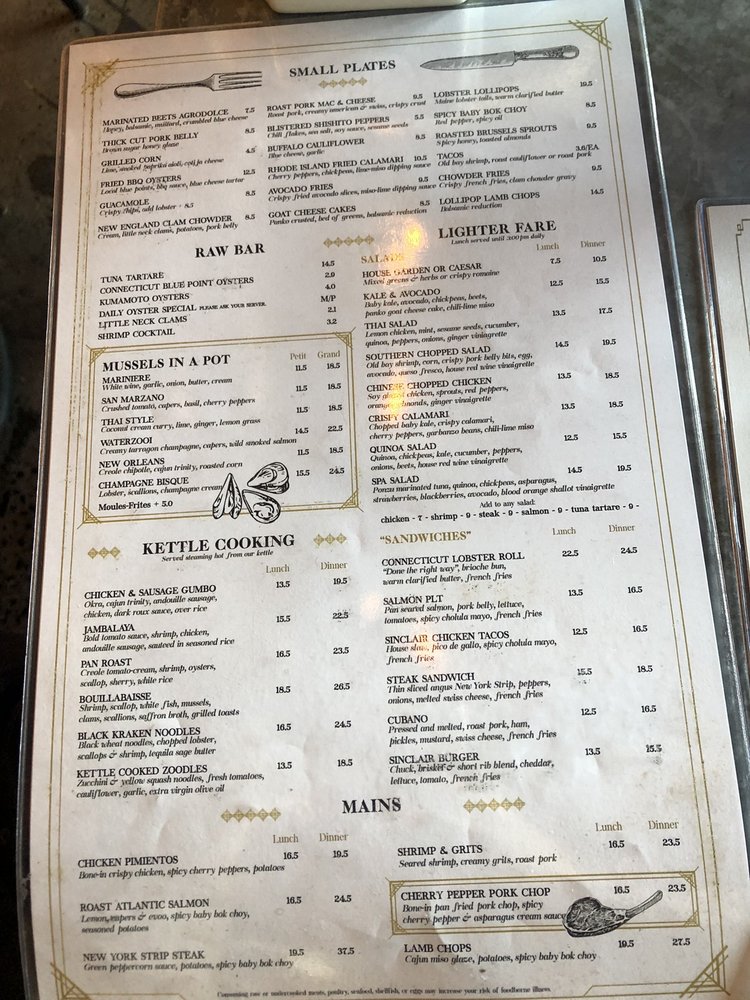 The Sinclair in Fairfield, CT, offers a diverse menu featuring small plates like Avocado Fries and Buffalo Cauliflower, along with unique Mussels in a Pot options like Champagne Bisque and Thai Style. Their raw bar includes fresh selections like Connecticut Blue Point Oysters and Tuna Tartare. Customers rave about the seafood stew and cocktails, praising the stylish decor and reasonable noise level. Diners appreciate the attentive service and variety of dishes, such as the cheeseburger egg rolls and jambalaya. The welcoming atmosphere, ample portions, and impressive drink selection make The Sinclair a must-visit for those seeking a classy and delicious dining experience.